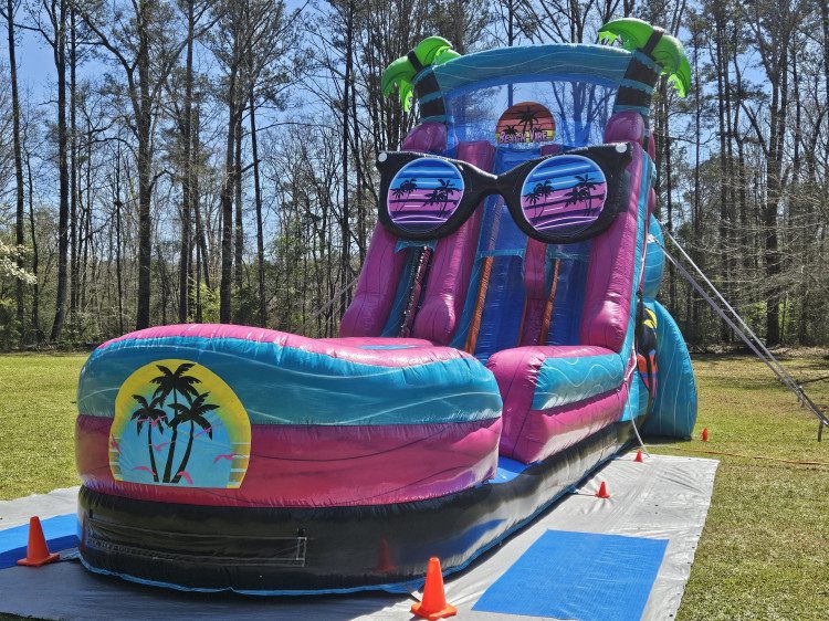 With two side‑by‑side lanes, riders can race each other down a wide, splash pool landing. Its eye‑catching colors, palm tree accents, and oversized sunglass motif make it perfect for pool parties, birthdays, school events, and community celebrations. The tall climbing wall provides a satisfying ascent before a fast, refreshing slide; mesh safety panels at the top keep riders secure, and high side walls on each lane help guide safe descents. Designed for wet use, this slide turns a yard or field into a beachfront escape kids and teens will remember.